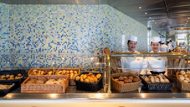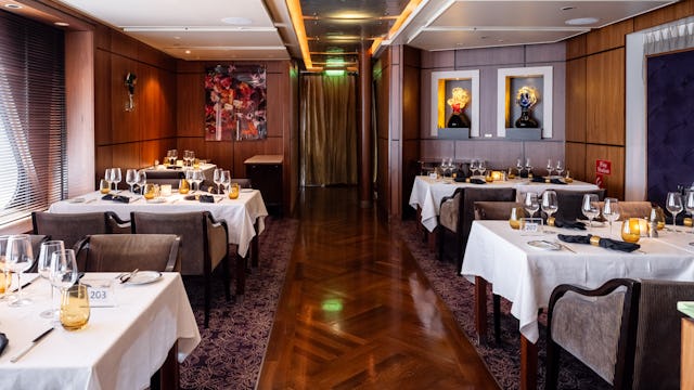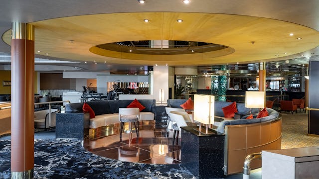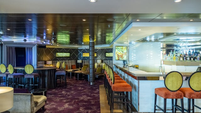 Perched at the ship’s bow on the top deck, this stylish lounge offers panoramic views by day and transforms into a lively nightclub with a DJ and live band by night.