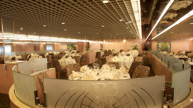 The main dining room onboard MSC Armonia offers a variety of tasty meals on the menu and is decorated in mauve and pink.