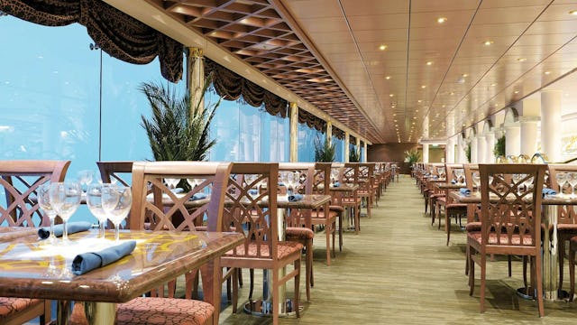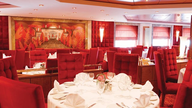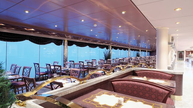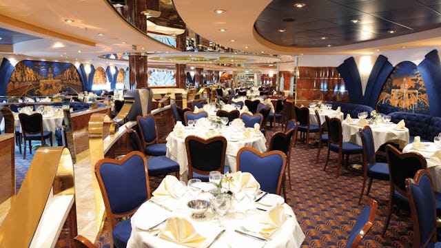 One of the main fine dining options onboard with a wide selection of international dishes to choose from for dinner including vegetarian and vegan options.