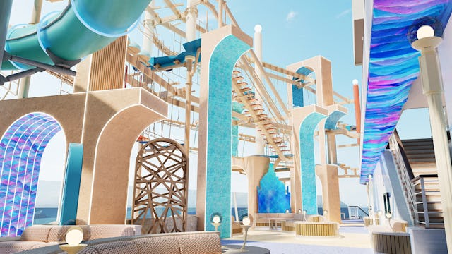 The ultimate open-air playground. Spanning Decks 18–21, this complex features the fleet’s most thrilling attractions, including the Eclipse Racers (dueling mat slides), The Wave (a pendulum raft ride), and the Aura Free Fall.