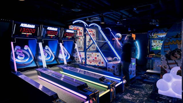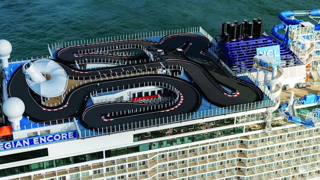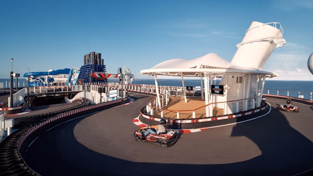 Get your adrenaline pumping at the largest race track at sea with high-speed corners suspended 13 feet off the side of the ship as you race to reach the chequered flag.