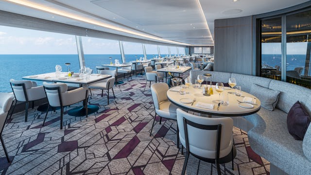 Enjoy 270-degree views of the horizon at this complimentary main dining room. The menu features a rotating selection of delicious, beautifully plated modern dishes.