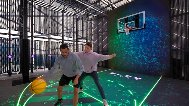 The future of play is here. This high-tech LED sports floor transforms from a sports court by day into a vibrant, illuminated lounge and nightclub by night.