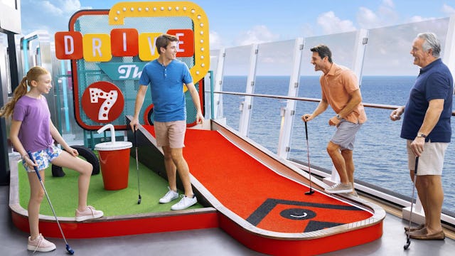 There are many activities onboard to enjoy, you can compete on race track, play mini golf with the whole family or relax at the onboard Spa.