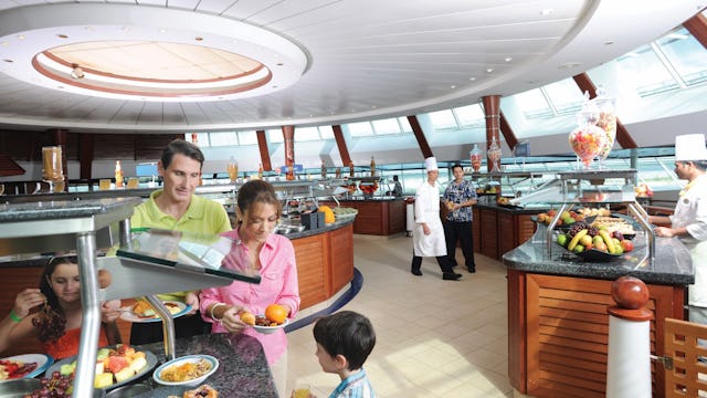 Each evening offers a distinct three-course meal featuring diverse international cuisines from Jamaica to Jaipur. Menu highlights include Maine lobster tail and filet mignon.