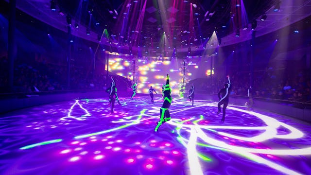 Witness all-star performers take the stage at the largest ice rink on a Royal Caribbean ship, showcasing breathtaking spins against immersive digital backdrops and captivating storylines.